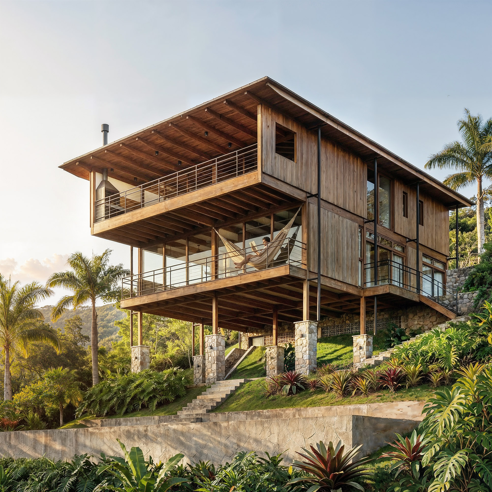 A casa se eleva sobre o talude como um pavilhão leve, pousado em pilotis de pedra que preservam o relevo e a vegetação tropical ao redor. A estrutura principal em madeira laminada colada organiza três lajes generosas sob um único beiral contínuo, desenhando varandas sombreadas e permeáveis. Entre cheios e vazios, painéis de tijolo aparente e caixilhos de madeira compõem um conjunto de tectônica clara.