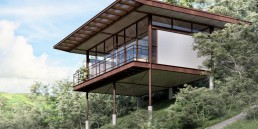 O trabalho pretende a atender a demanda por um residência com quadro programático robusto objetivando uma arquitetura visualmente leve. Algumas operações em projeto foram cruciais para atingirmos tal meta, as principais são: valorização da esquina (e paisagismo) em detrimento da fachada construída, organização do programa residencial em três pisos (incluindo piso inferior para depósito e área técnica) e o pleno uso da estrutura metálica.