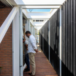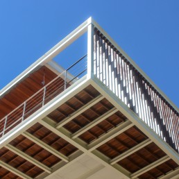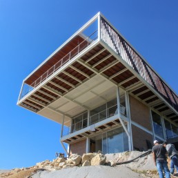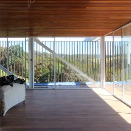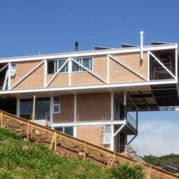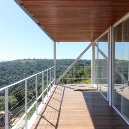 A adoção da estrutura metálica foi essencial no entendimento da implantação do projeto. Seu papel é o de garantir uma construção mais eficiente e segura numa área de encosta e também propiciar grandes balanços estruturais, cruciais para obtermos uma casa aérea, com menos pontos de fundações e que valorize a vista.