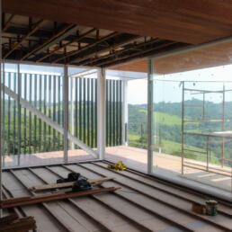 A implantação em três pisos propiciou ao projeto melhor adequação ao perfil natural do terreno, permitindo assim um melhor aproveitamento do mesmo e também menor movimentação de terra. Os ambientes foram orientados em três grupos, de acordo com seu pavimento. No andar principal, mais acima, foram mantidos os ambientes da área de convívio, todos em contato com a vista estonteante do entorno e também a suíte master. No piso intermediário foram inseridas duas suítes extras, uma sala íntima e escritório, estes últimos também com vista plena. No pavimento mais abaixo temos área de serviço e lounge para servir como apoio à piscina.