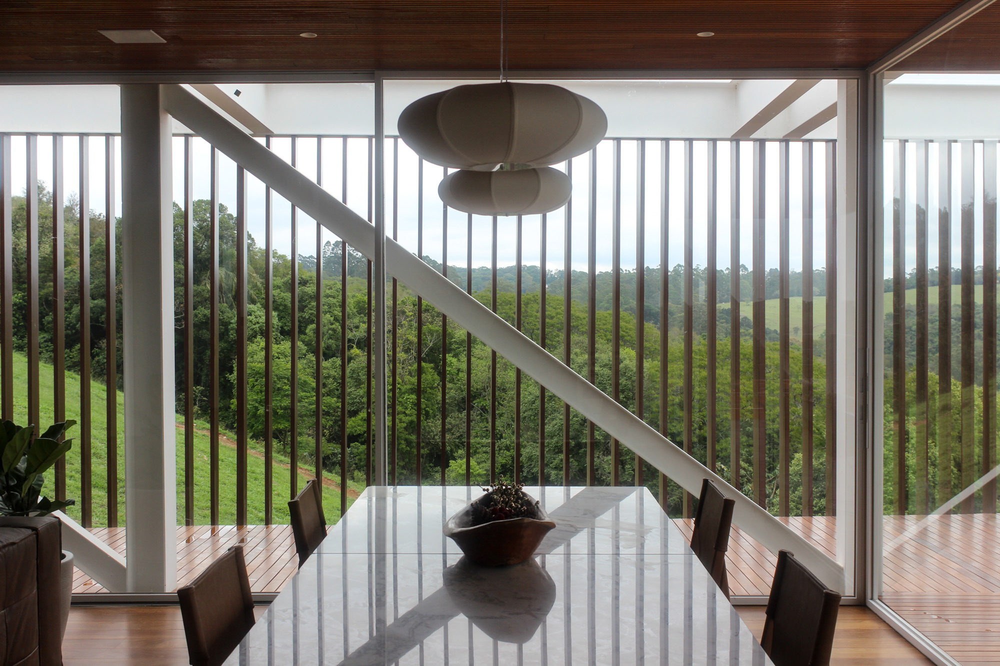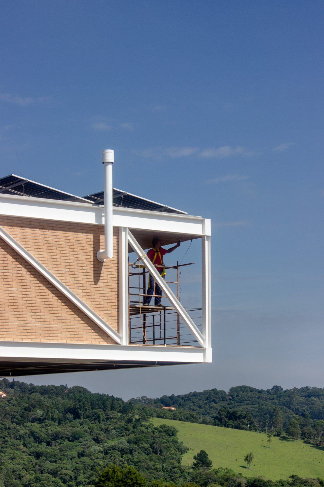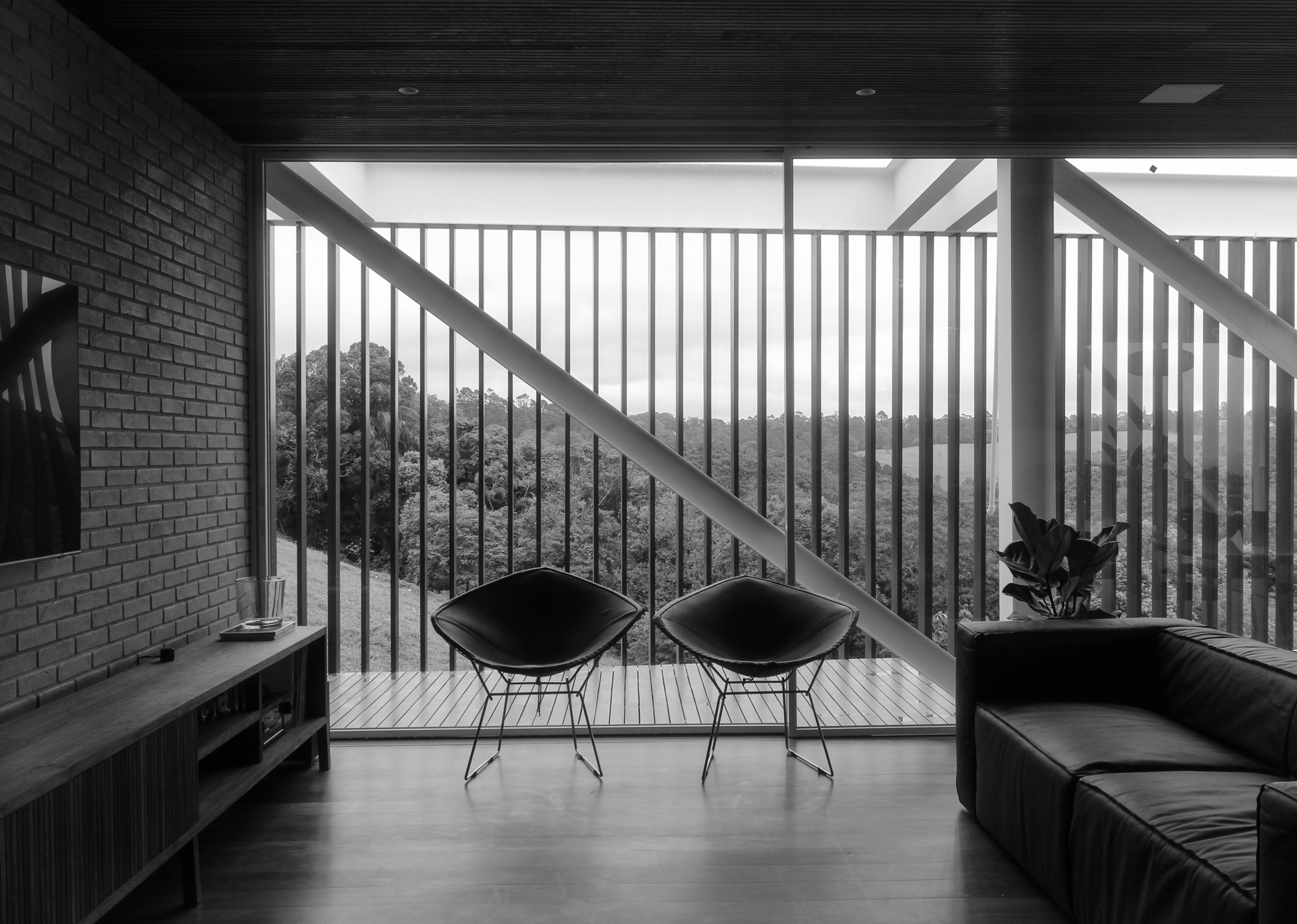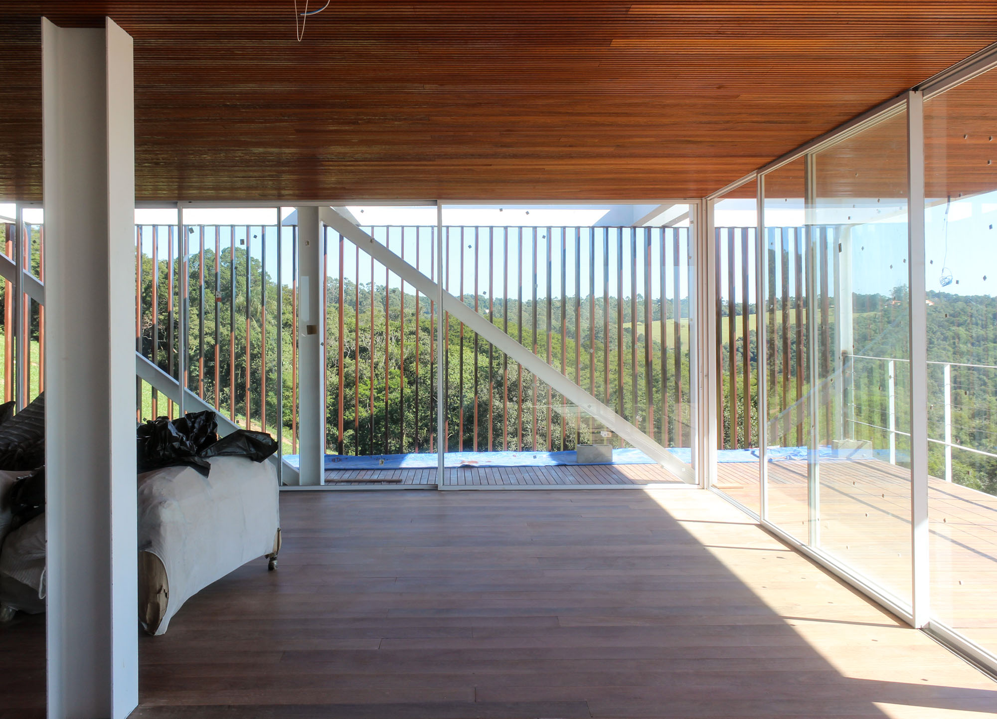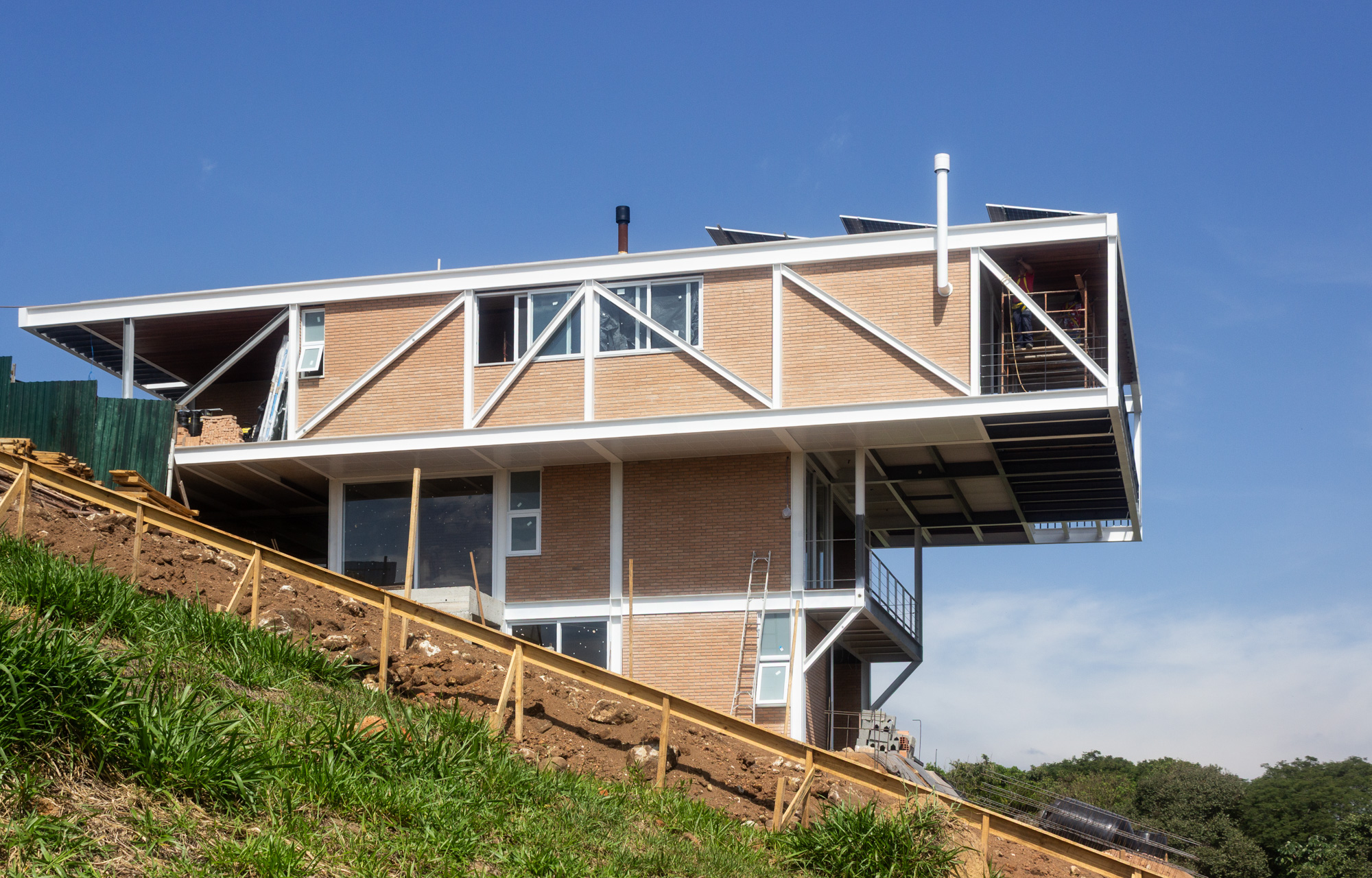 A adoção da estrutura metálica foi essencial no entendimento da implantação do projeto. Seu papel é o de garantir uma construção mais eficiente e segura numa área de encosta e também propiciar grandes balanços estruturais, cruciais para obtermos uma casa aérea, com menos pontos de fundações e que valorize a vista.