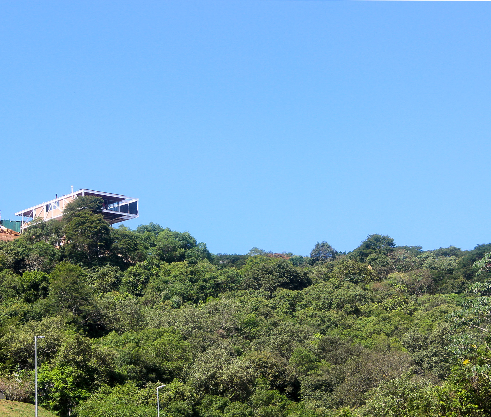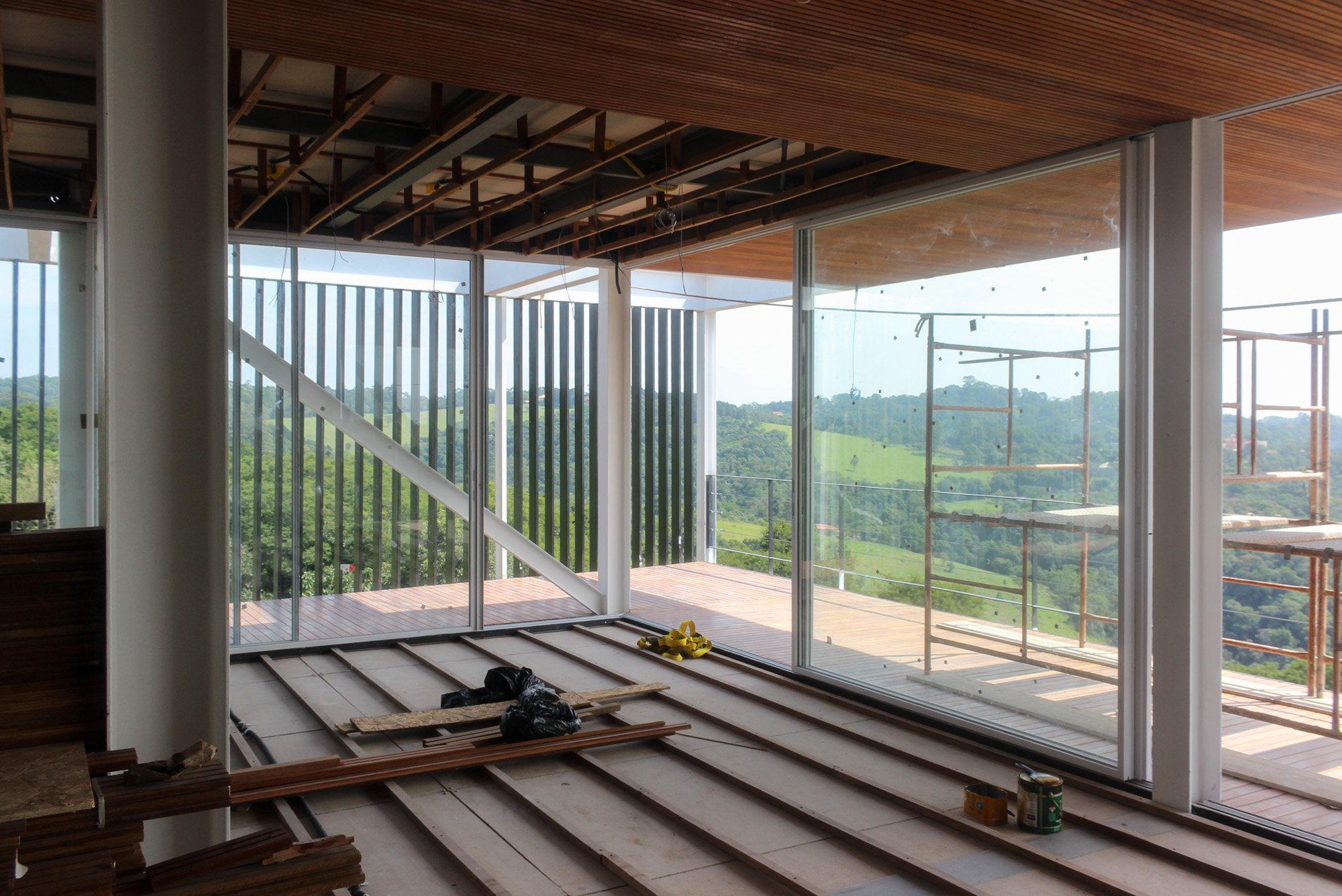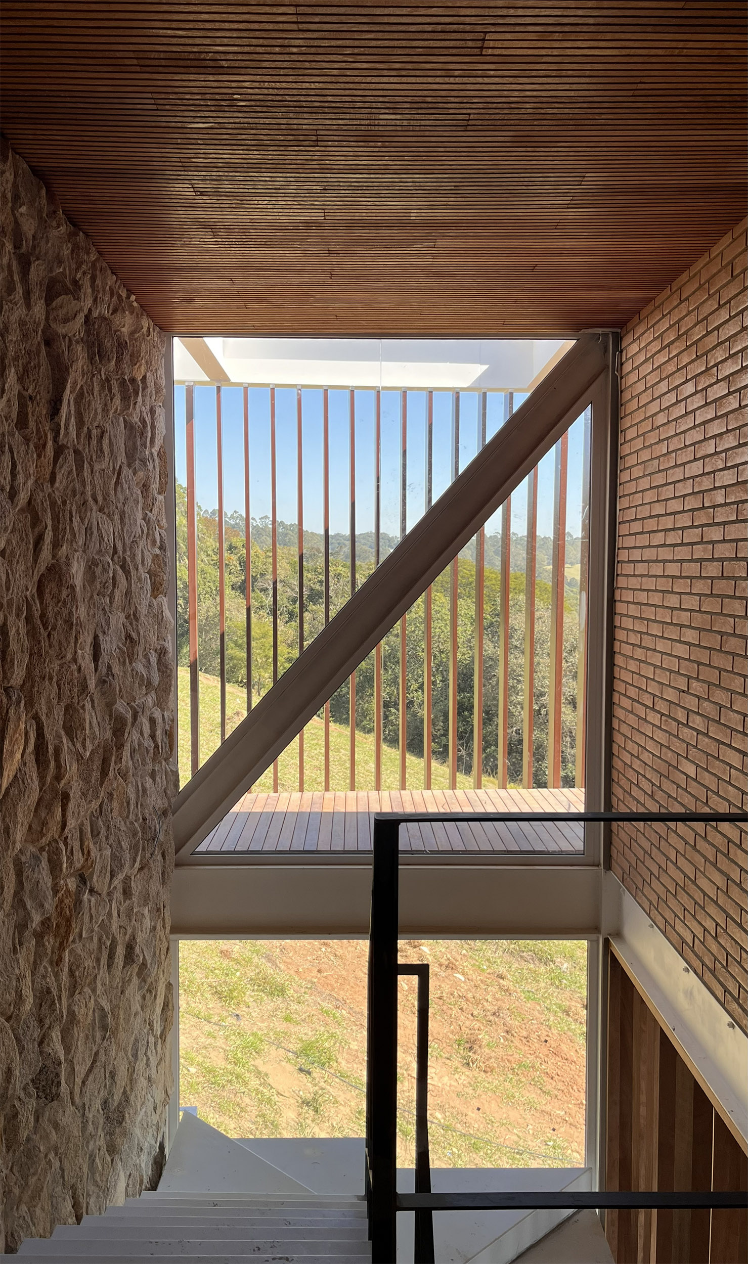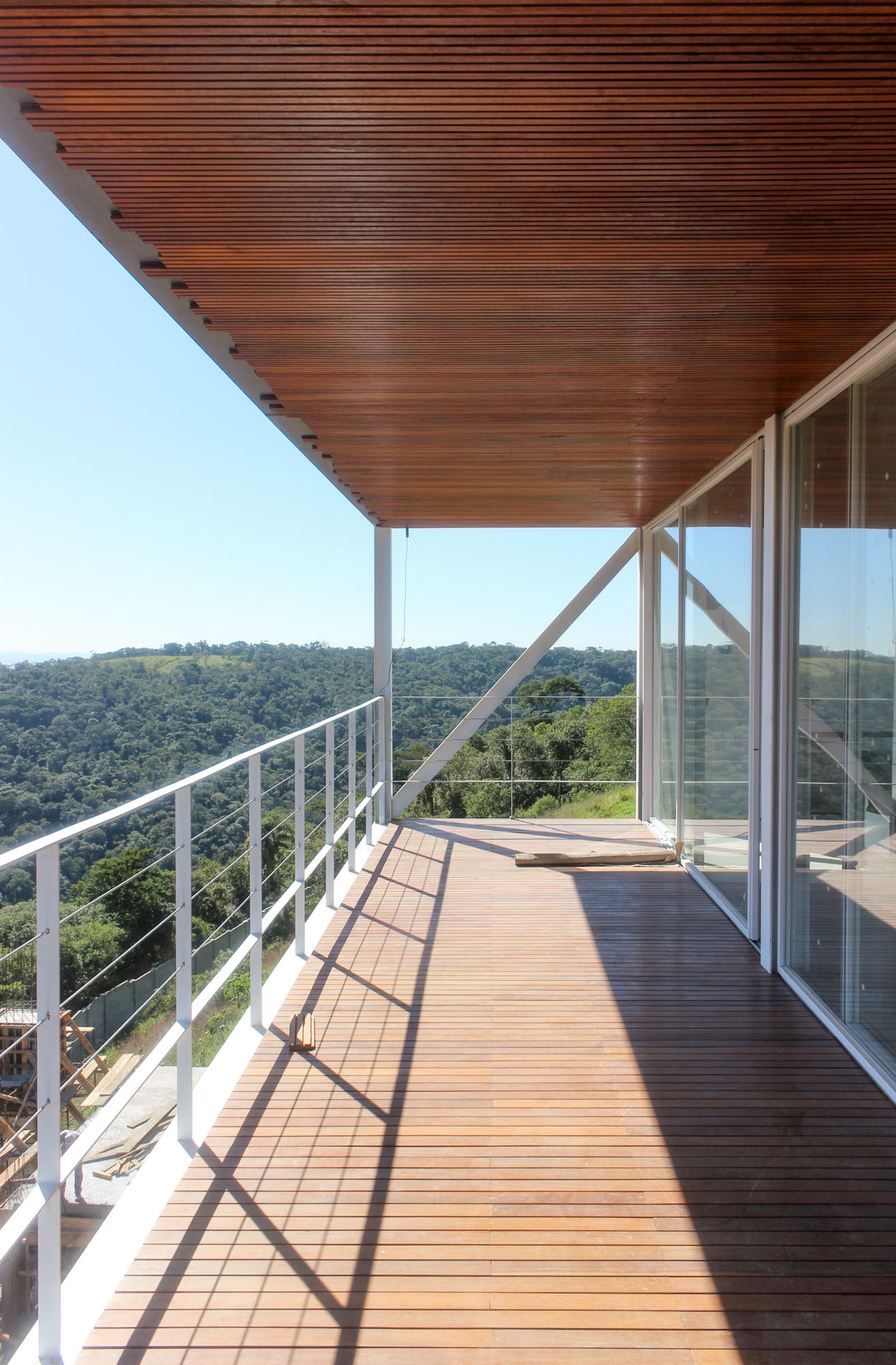 A adoção da estrutura metálica foi essencial no entendimento da implantação do projeto. Seu papel é o de garantir uma construção mais eficiente e segura numa área de encosta e também propiciar grandes balanços estruturais, cruciais para obtermos uma casa aérea, com menos pontos de fundações e que valorize a vista.