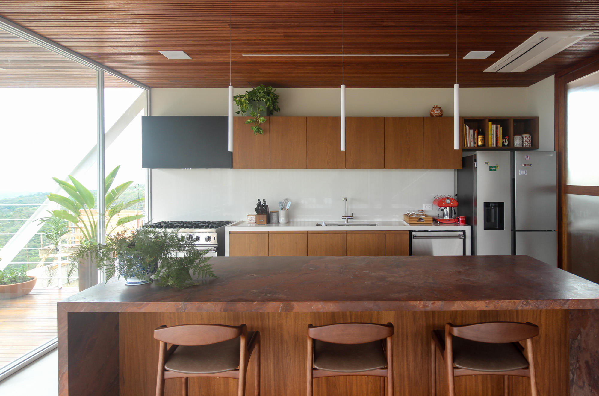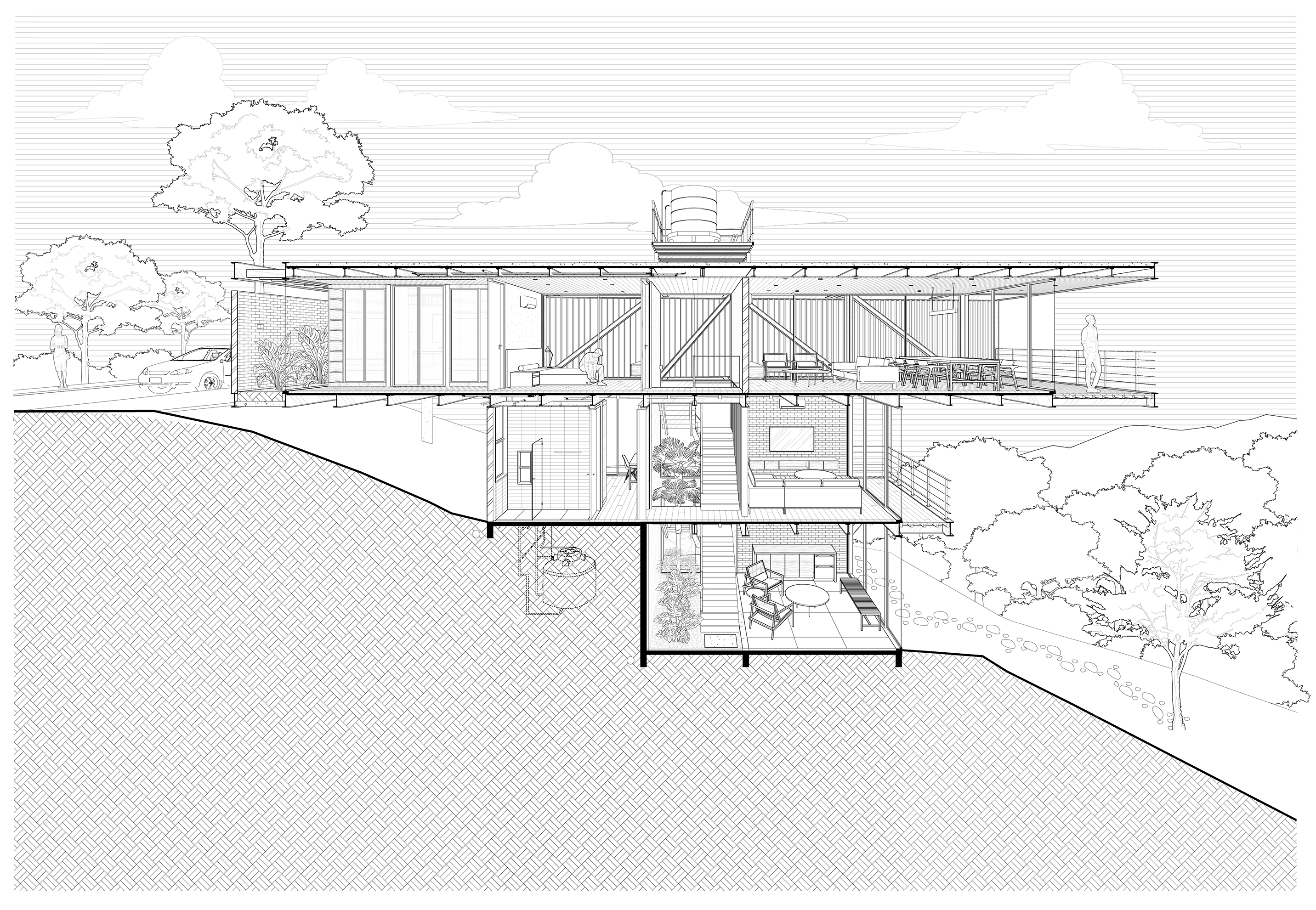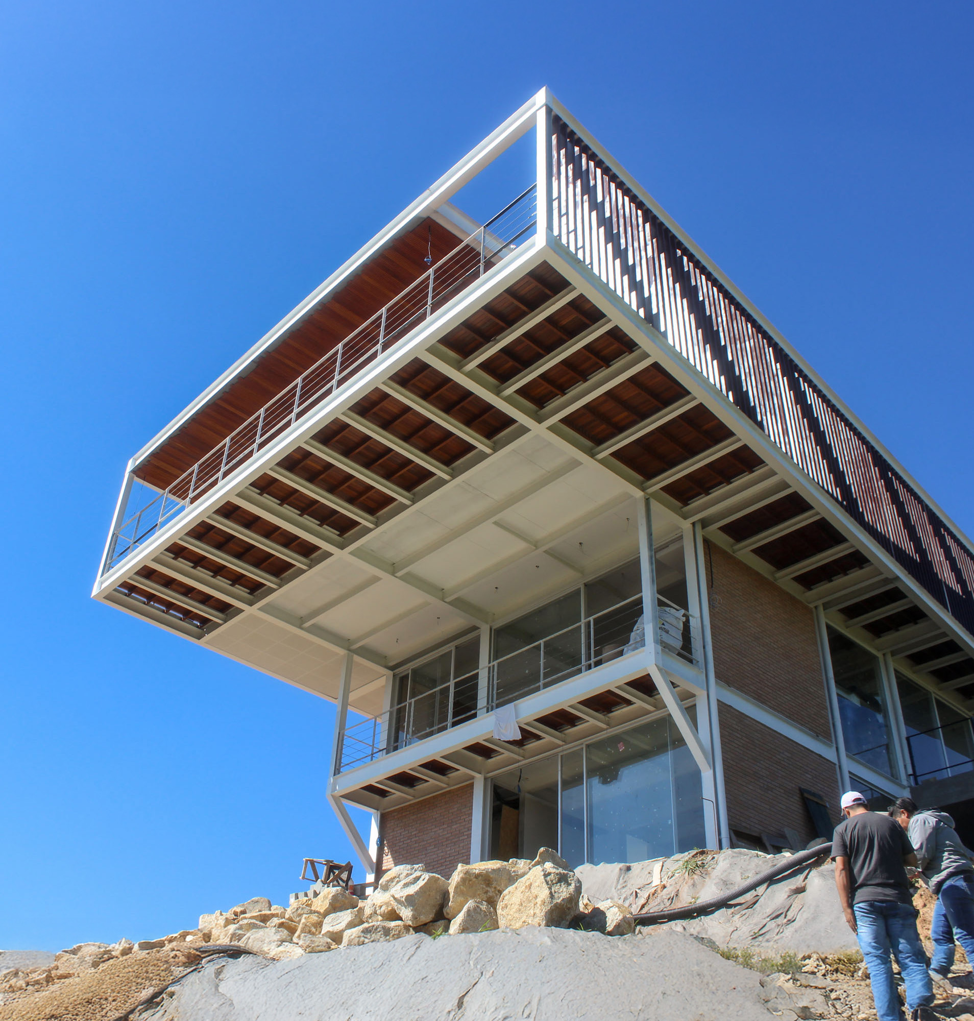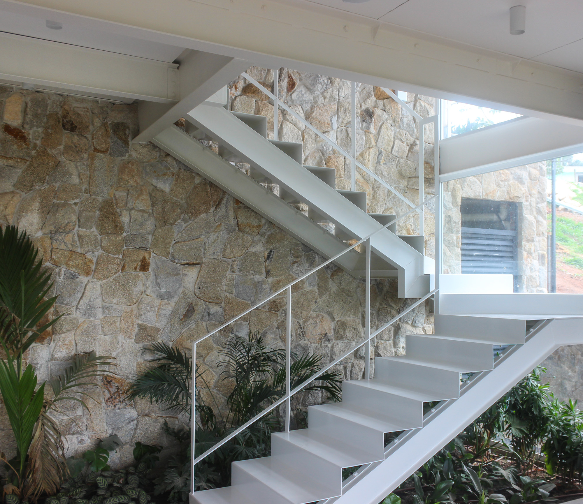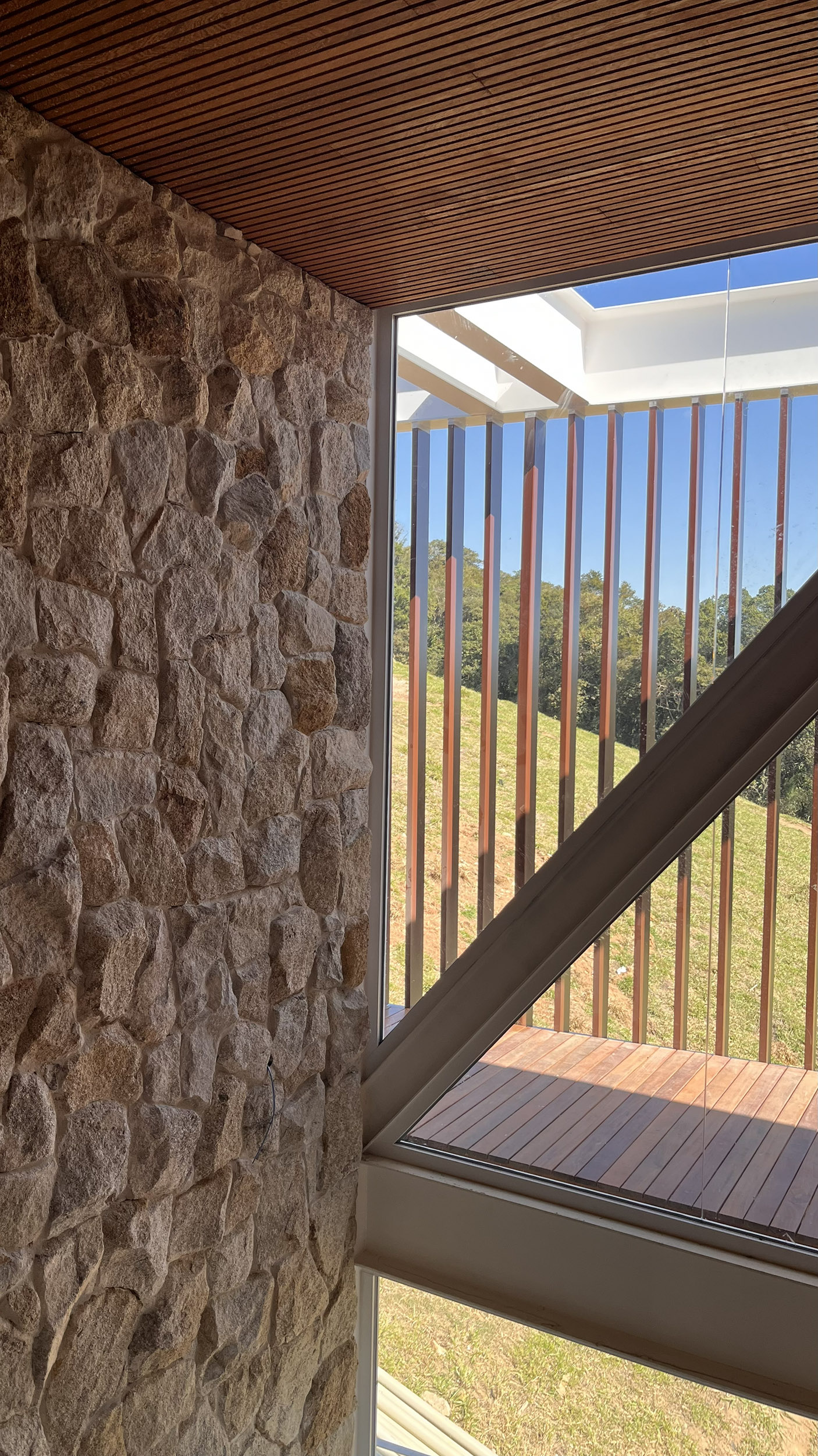 A adoção da estrutura metálica foi essencial no entendimento da implantação do projeto. Seu papel é o de garantir uma construção mais eficiente e segura numa área de encosta e também propiciar grandes balanços estruturais, cruciais para obtermos uma casa aérea, com menos pontos de fundações e que valorize a vista.