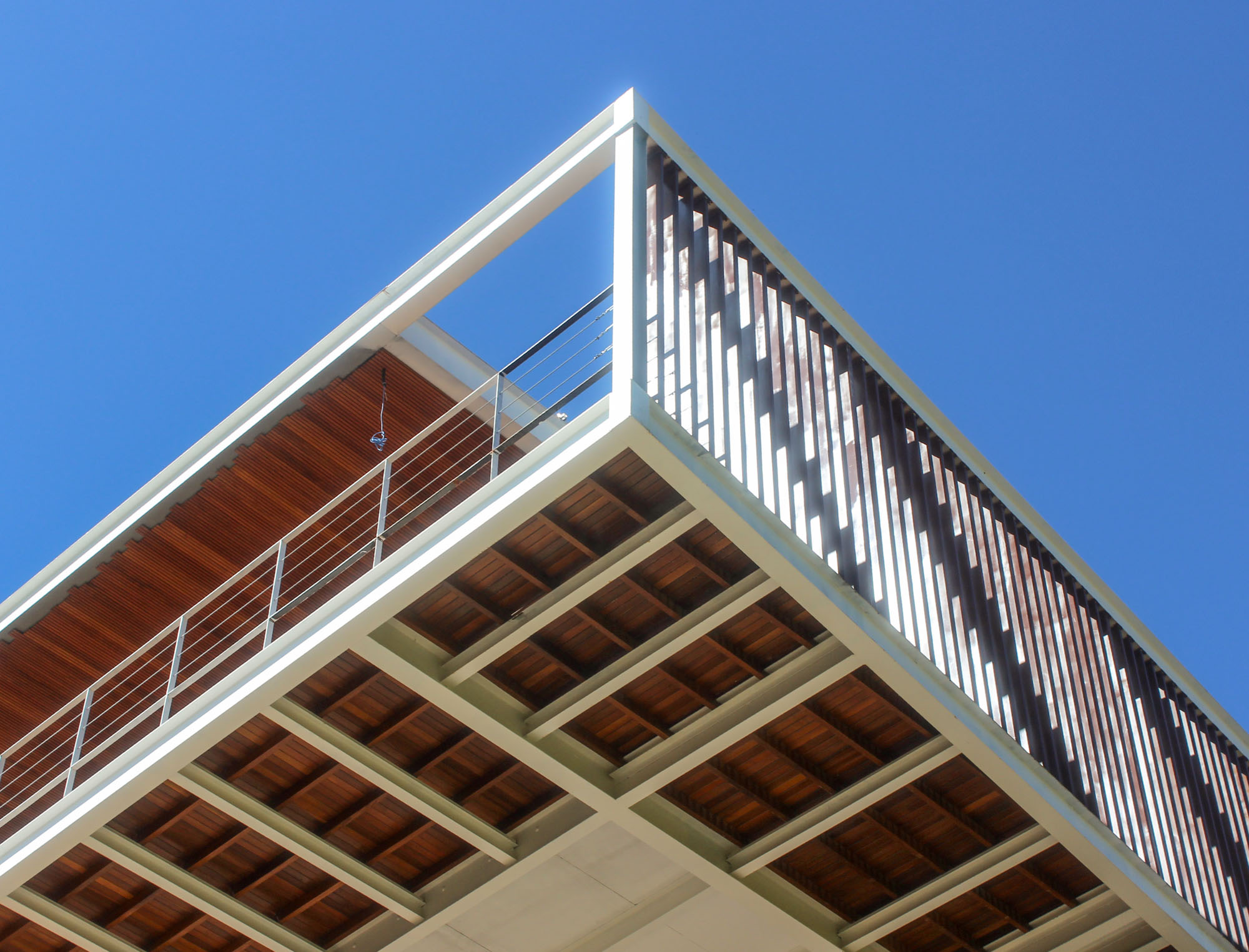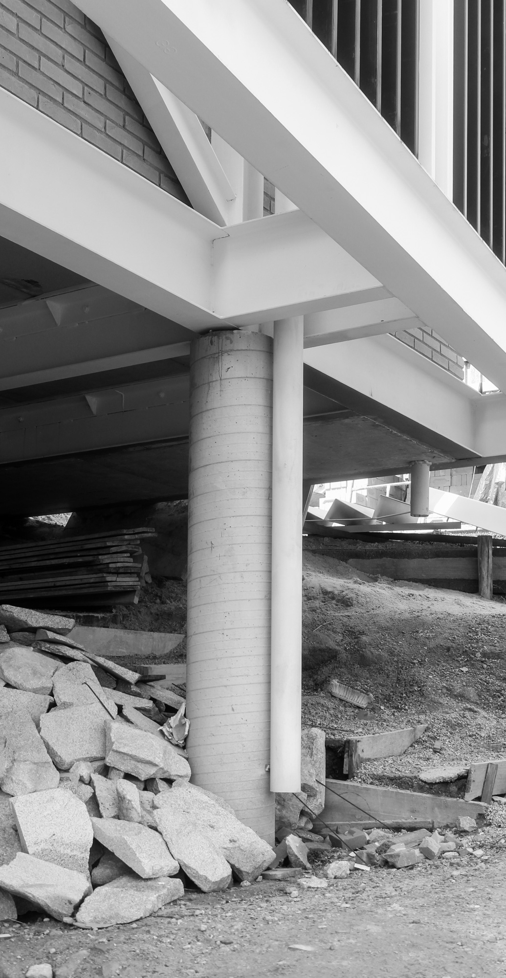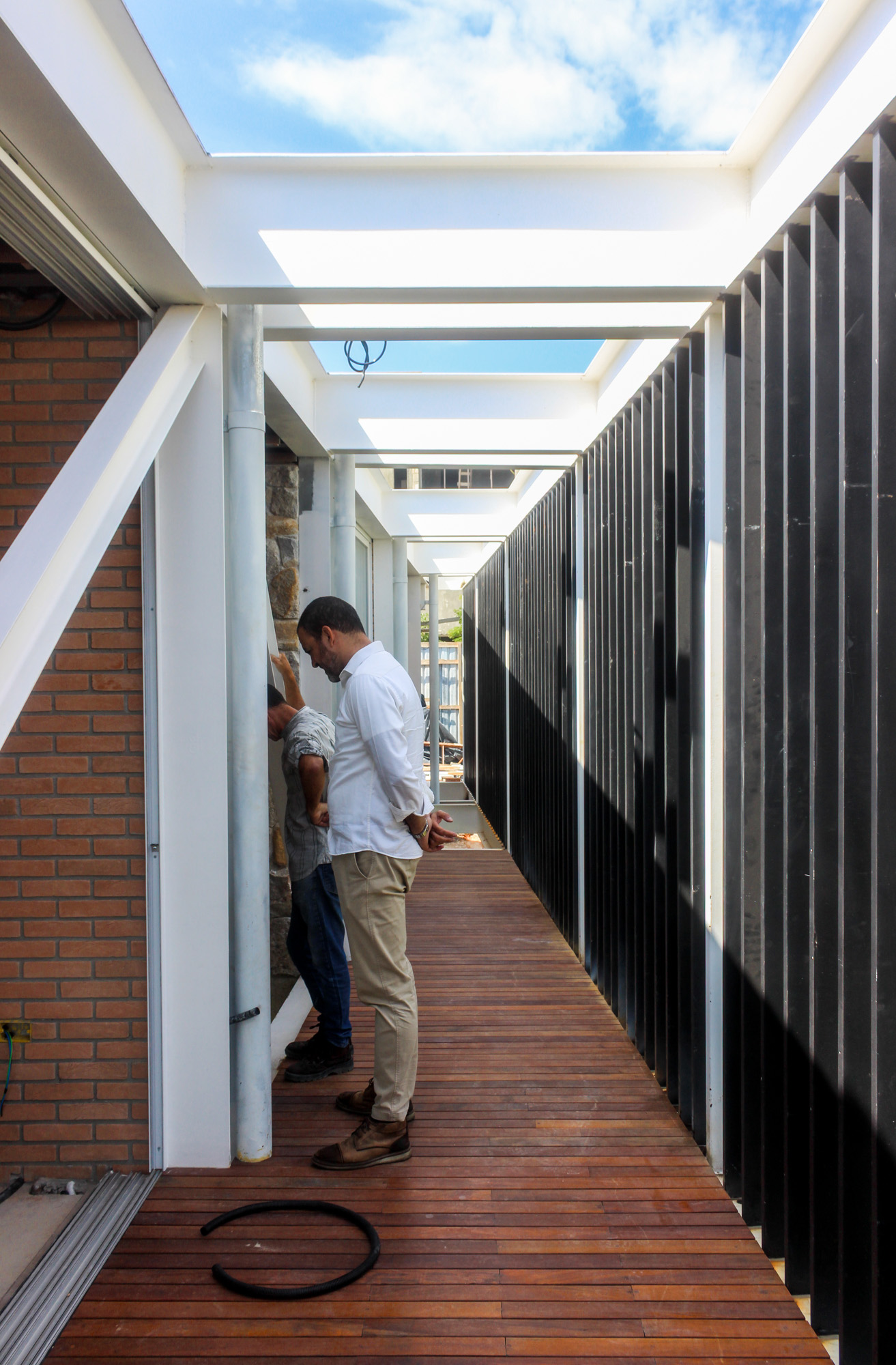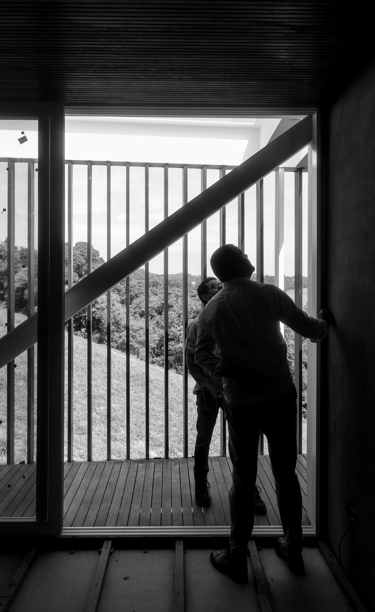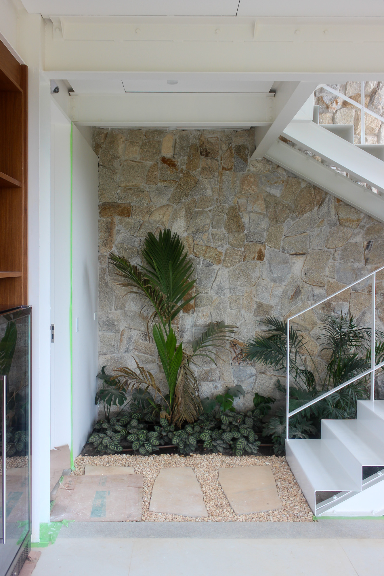 A adoção da estrutura metálica foi essencial no entendimento da implantação do projeto. Seu papel é o de garantir uma construção mais eficiente e segura numa área de encosta e também propiciar grandes balanços estruturais, cruciais para obtermos uma casa aérea, com menos pontos de fundações e que valorize a vista.