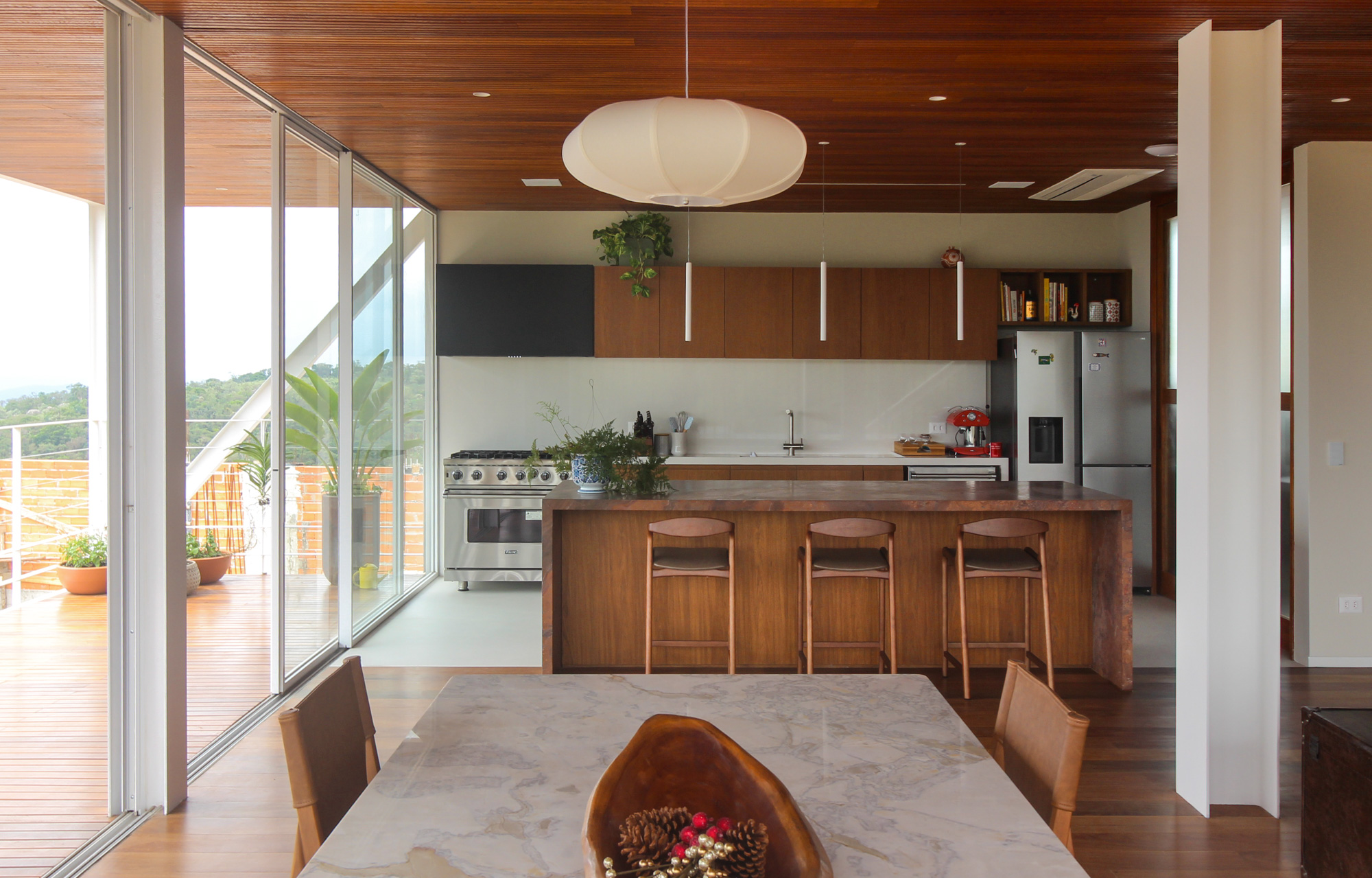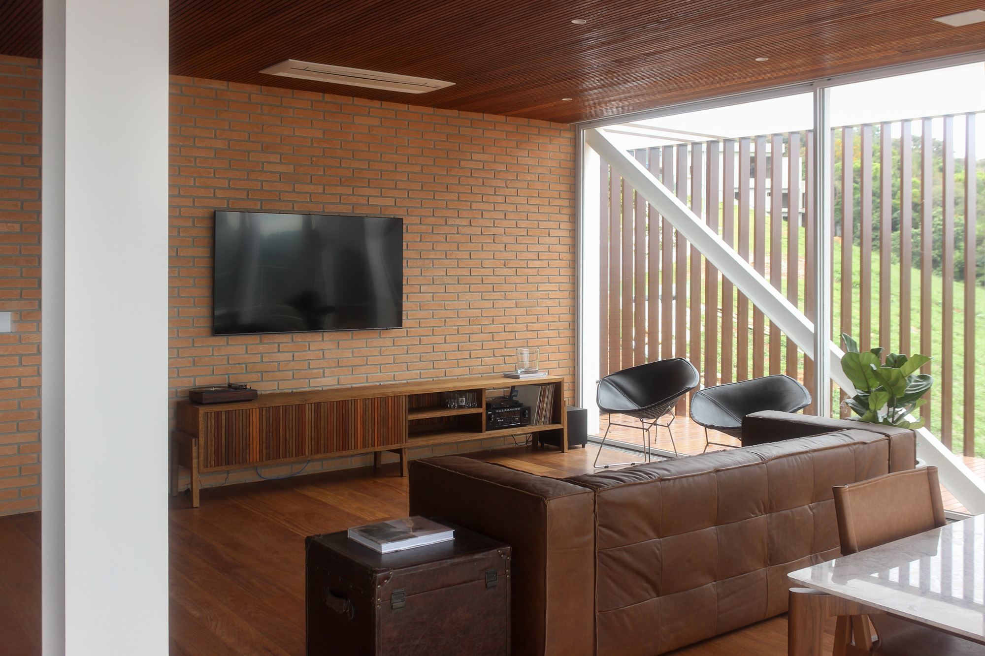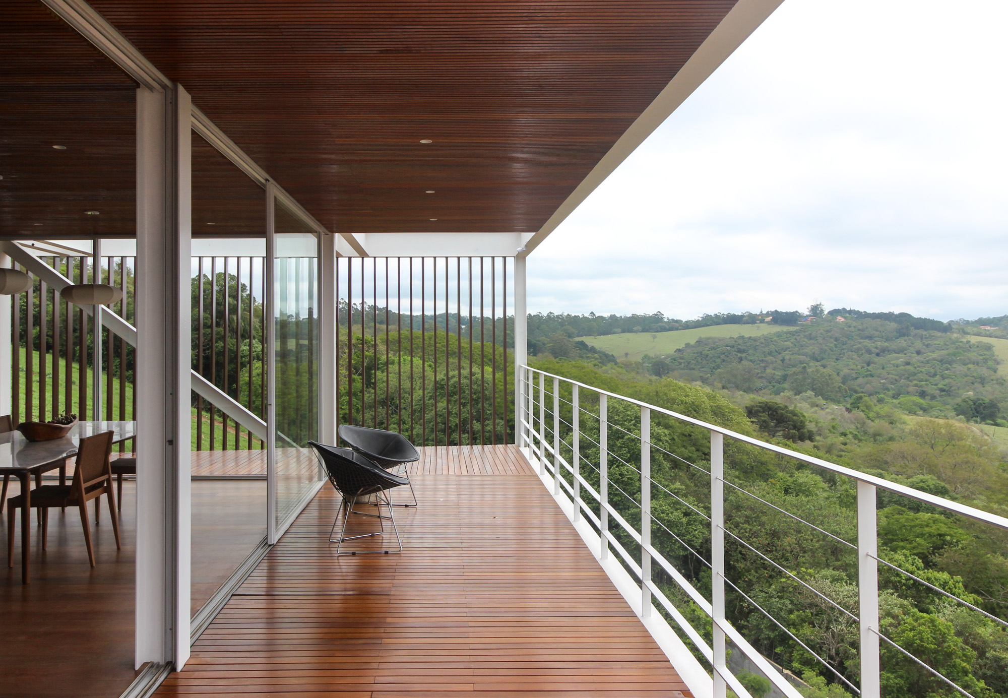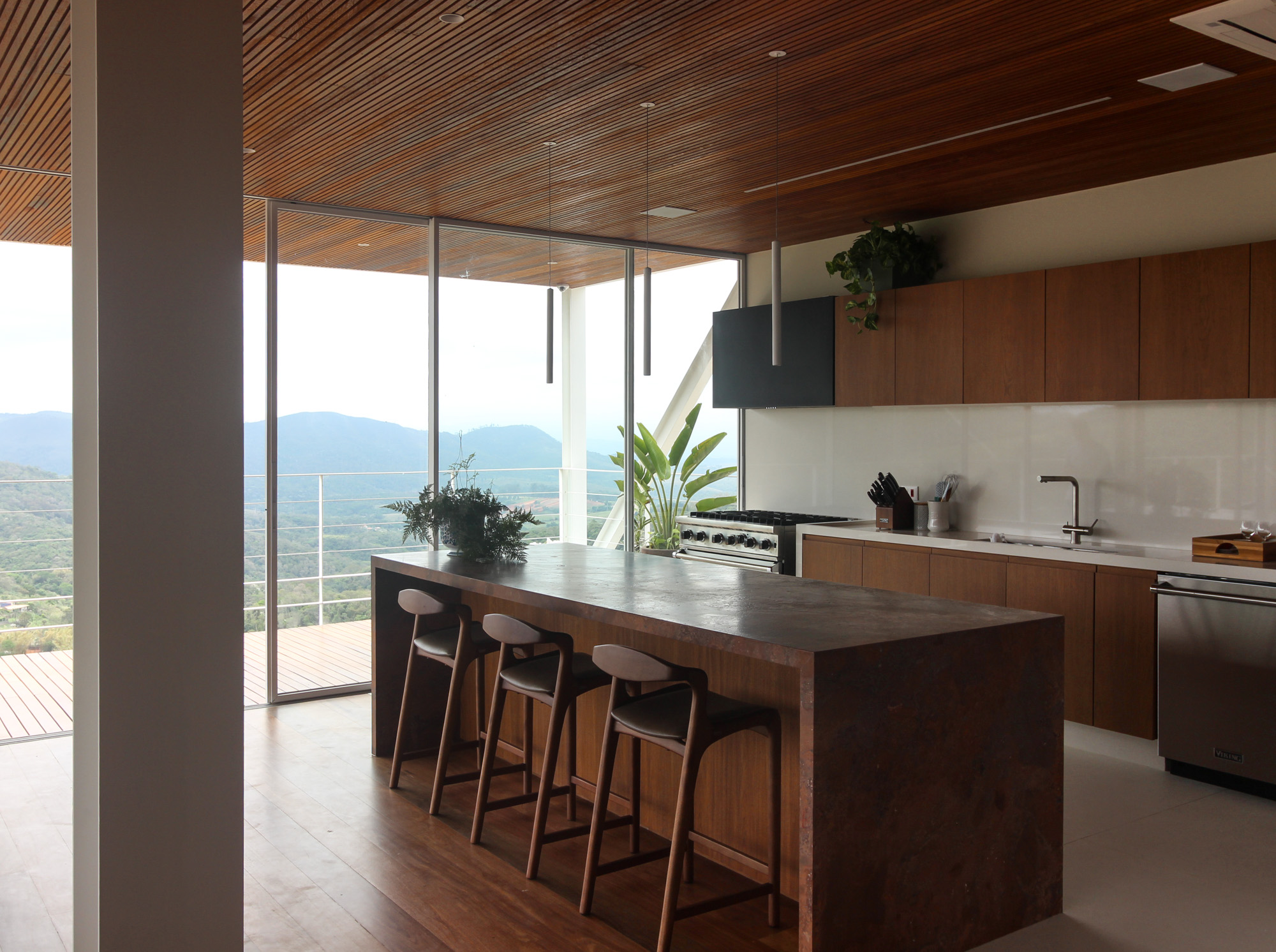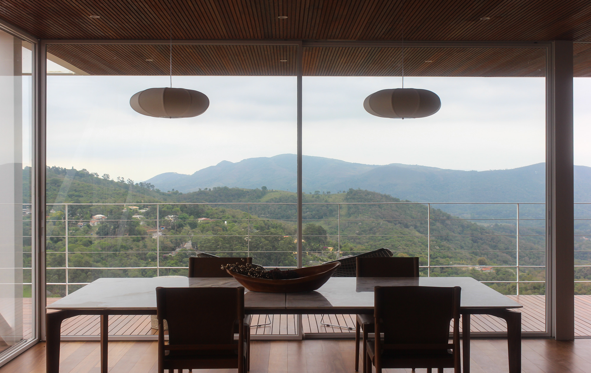 A implantação em três pisos propiciou ao projeto melhor adequação ao perfil natural do terreno, permitindo assim um melhor aproveitamento do mesmo e também menor movimentação de terra. Os ambientes foram orientados em três grupos, de acordo com seu pavimento. No andar principal, mais acima, foram mantidos os ambientes da área de convívio, todos em contato com a vista estonteante do entorno e também a suíte master. No piso intermediário foram inseridas duas suítes extras, uma sala íntima e escritório, estes últimos também com vista plena. No pavimento mais abaixo temos área de serviço e lounge para servir como apoio à piscina.