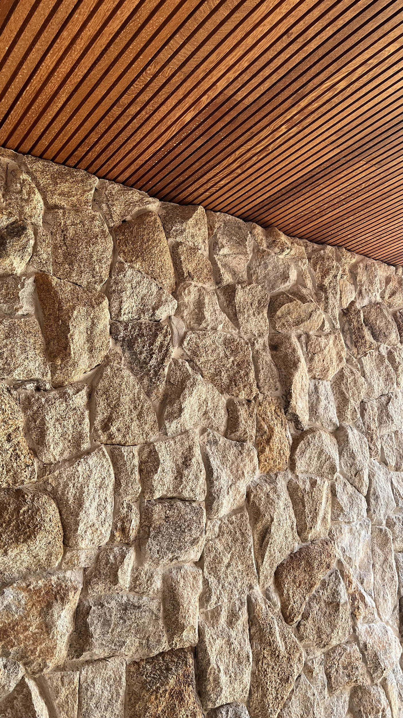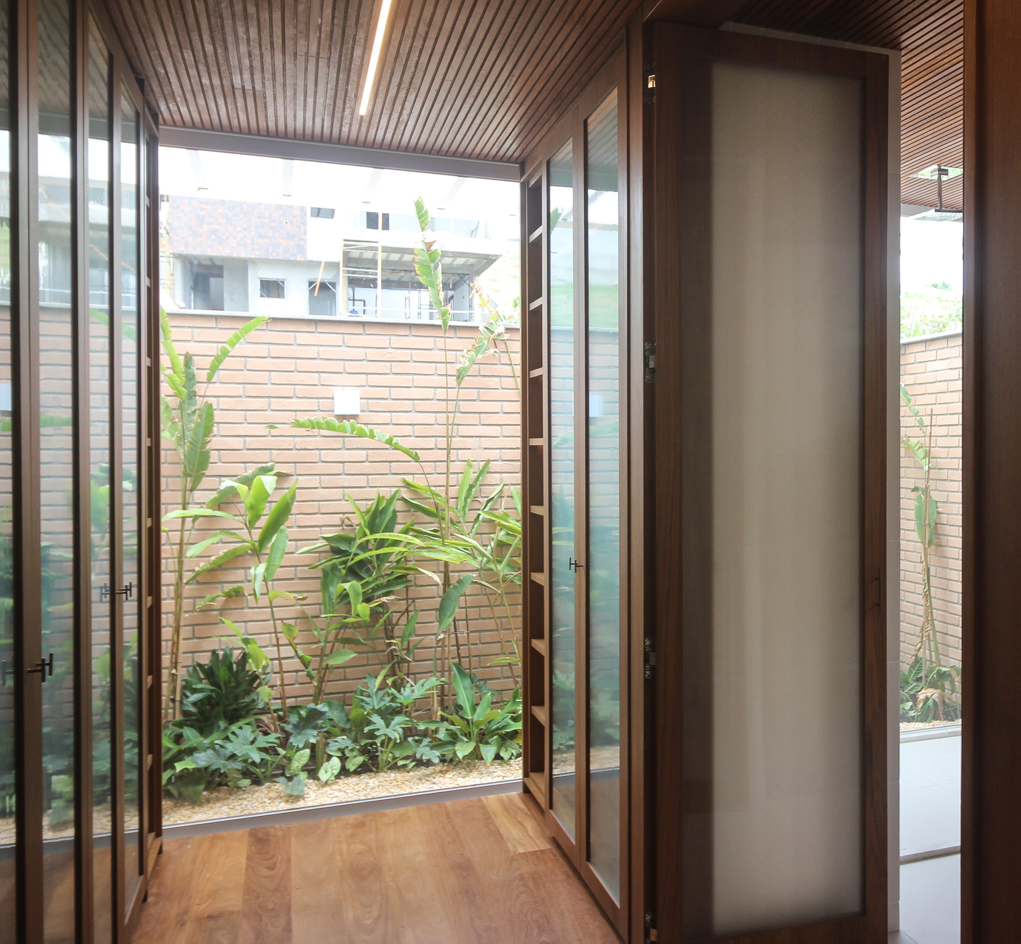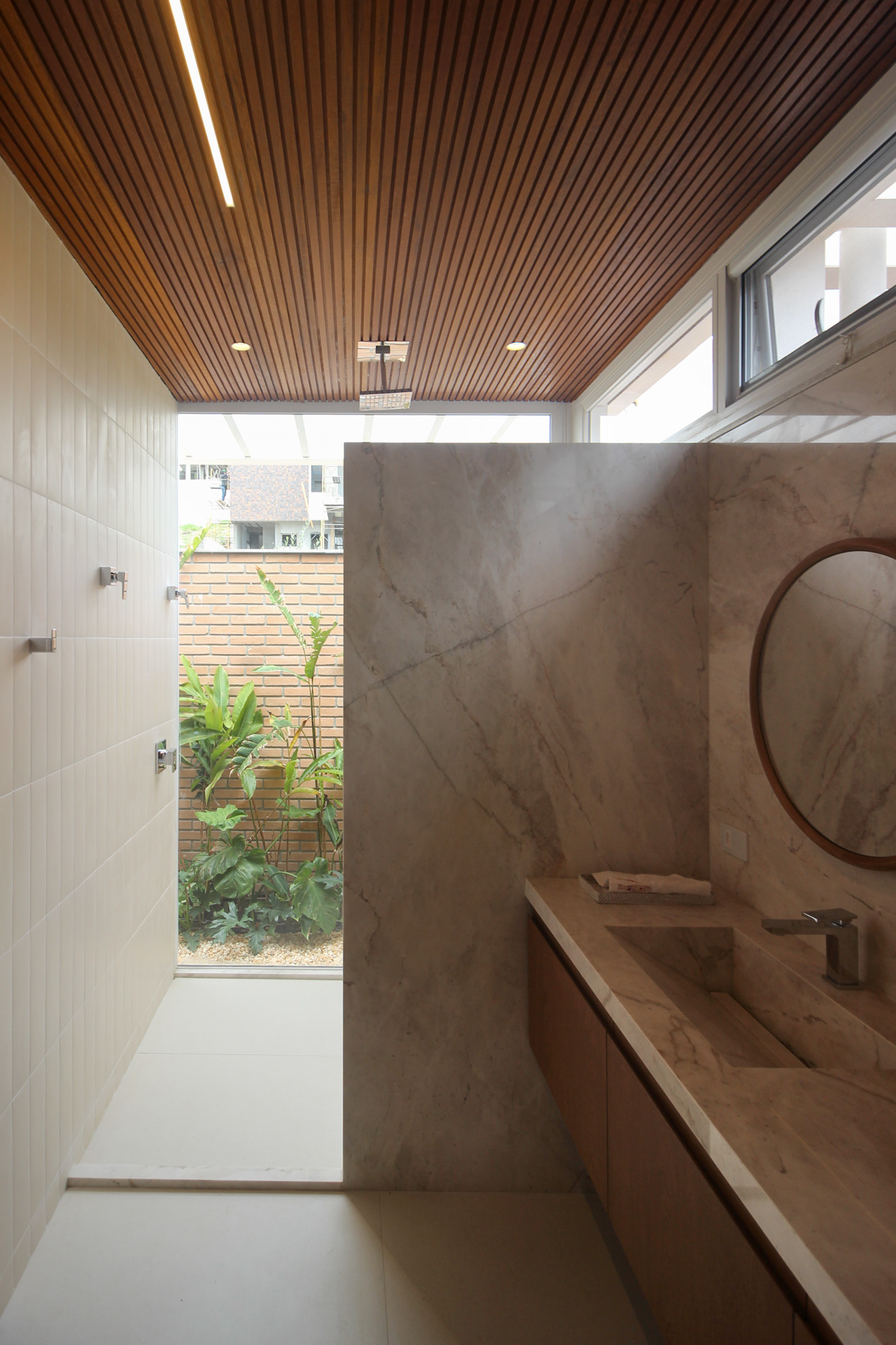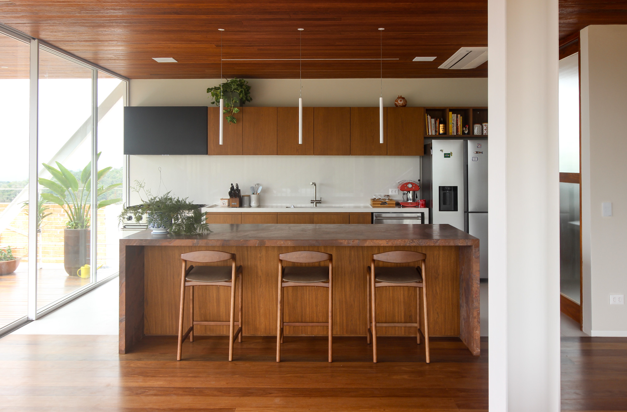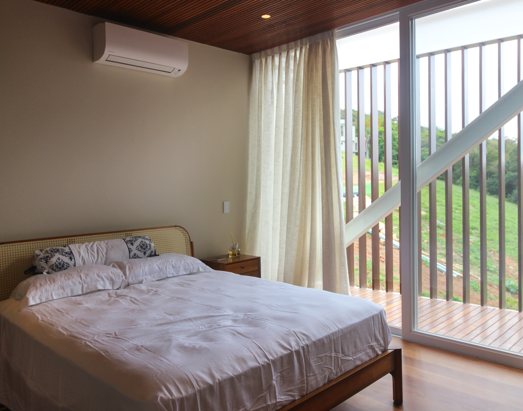 A implantação em três pisos propiciou ao projeto melhor adequação ao perfil natural do terreno, permitindo assim um melhor aproveitamento do mesmo e também menor movimentação de terra. Os ambientes foram orientados em três grupos, de acordo com seu pavimento. No andar principal, mais acima, foram mantidos os ambientes da área de convívio, todos em contato com a vista estonteante do entorno e também a suíte master. No piso intermediário foram inseridas duas suítes extras, uma sala íntima e escritório, estes últimos também com vista plena. No pavimento mais abaixo temos área de serviço e lounge para servir como apoio à piscina.