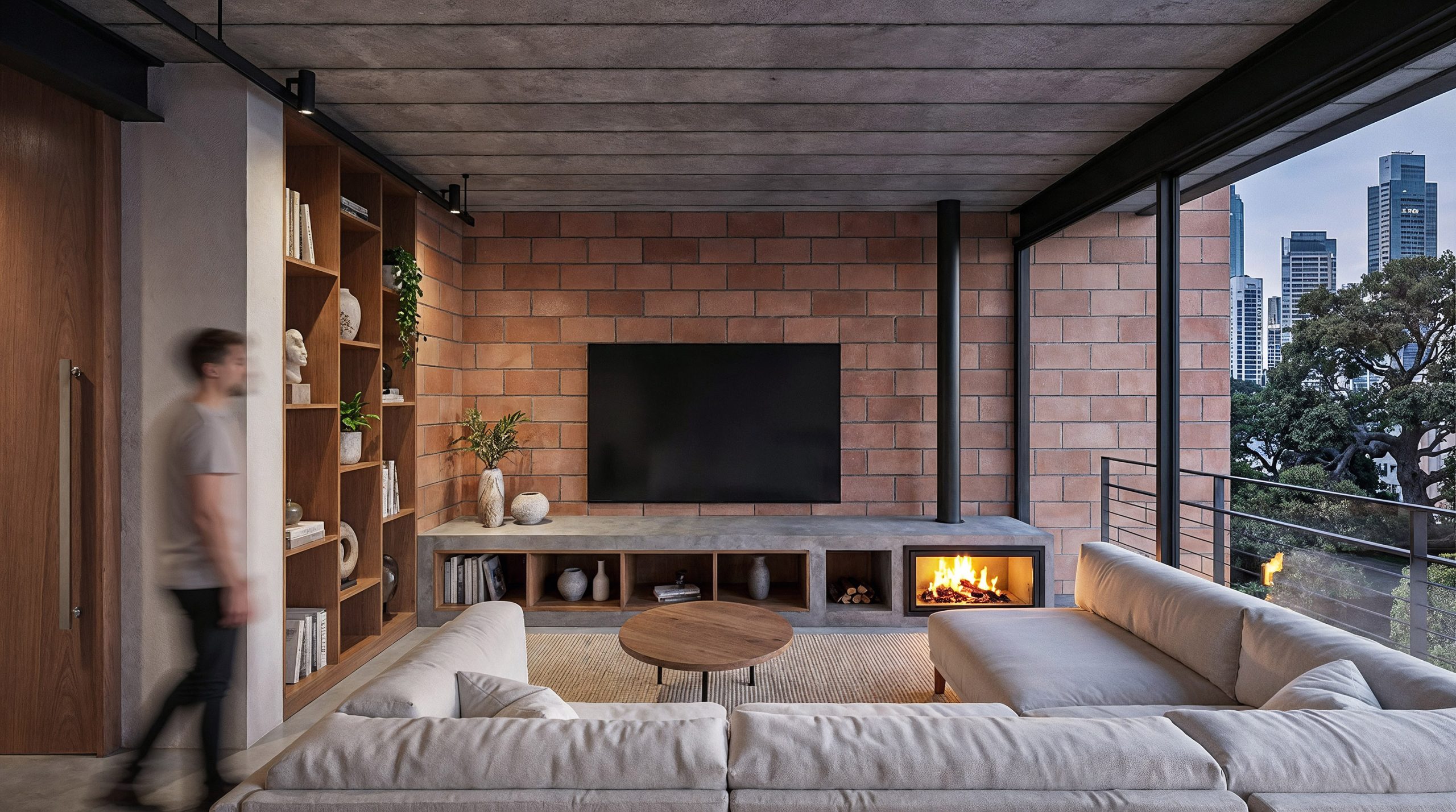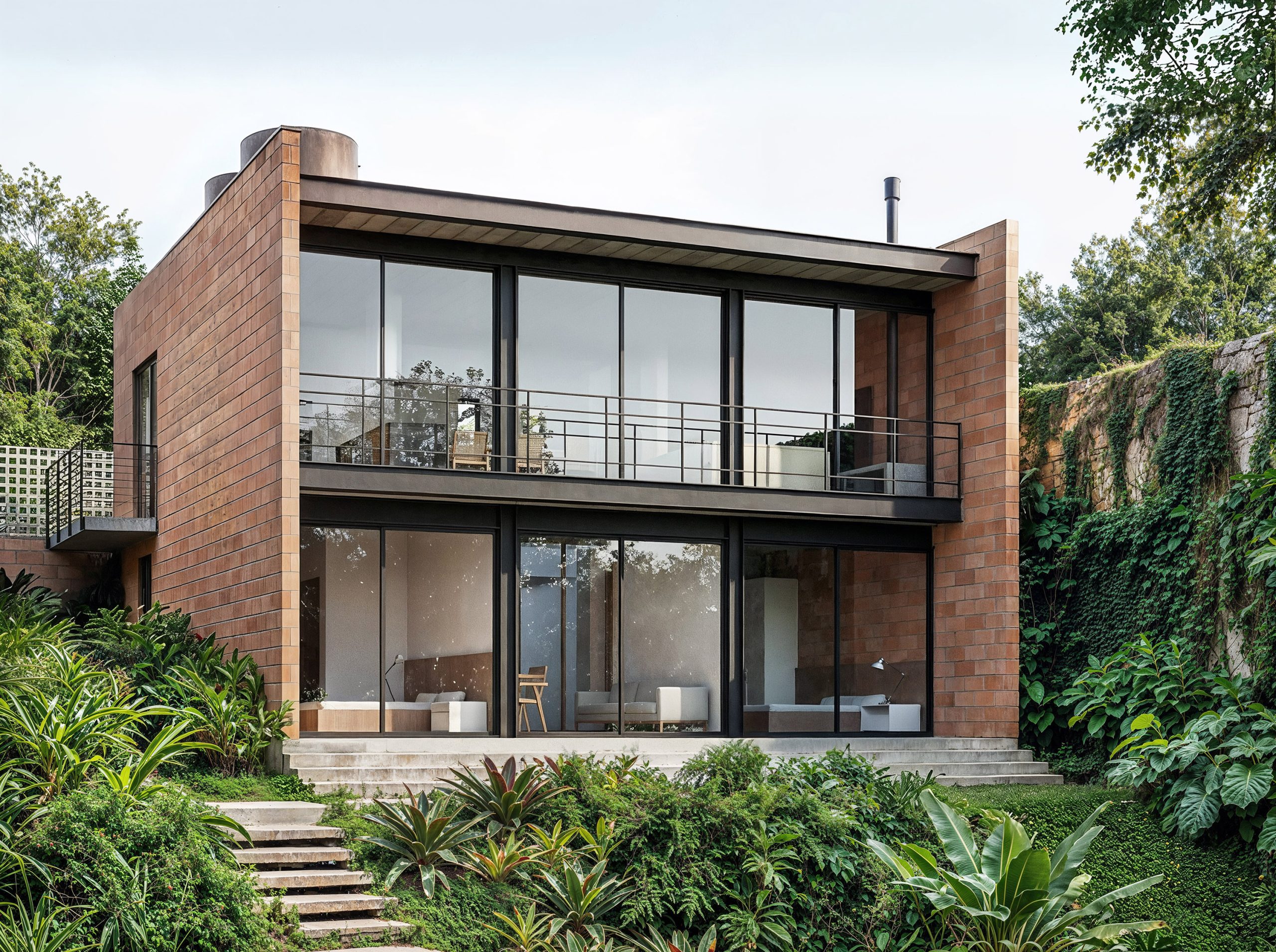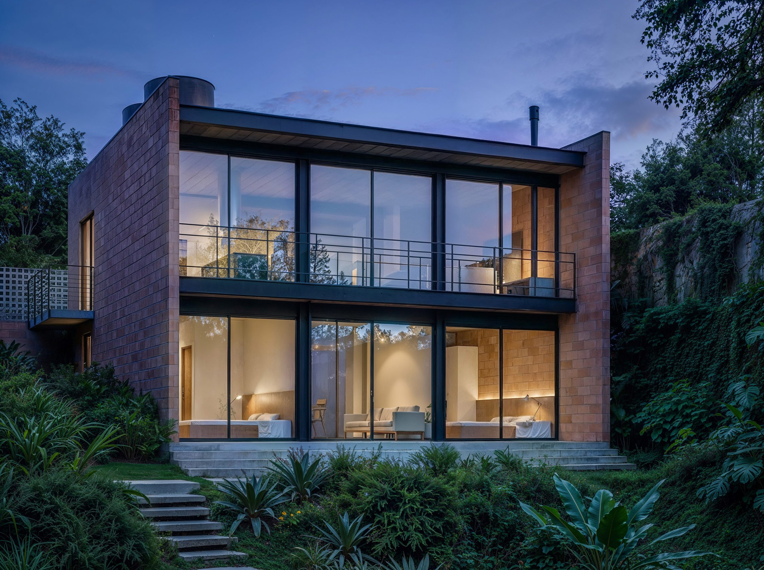 Implantada de forma sensível à topografia existente, a residência apresenta uma arquitetura que dialoga com o entorno sem recorrer a gestos excessivos. O volume principal, de linhas retas e proporções bem definidas, é marcado pelo uso expressivo do bloco cerâmico aparente, material que confere solidez, textura e uma sensação de permanência. Em contraste, a utilização de vigas metálicas propicia a abertura de grandes panos de vidro que revelam a leveza do projeto e permitem que a paisagem seja parte integrante da experiência espacial, diluindo os limites entre interior e exterior.